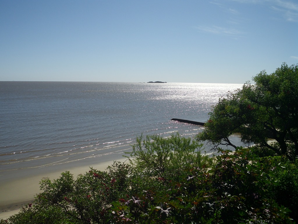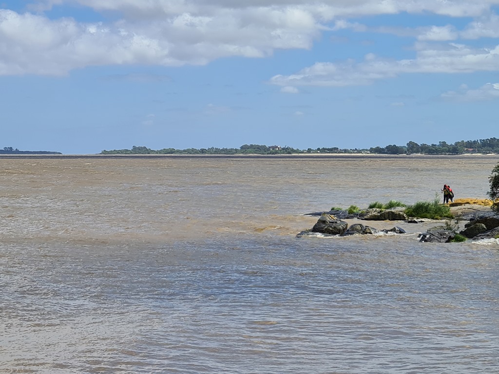 Der Rio de la Plata ist nur ca. 20 Meter tief, 270km lang und bis zu 220km breit und besteht aus 2 Flüssen: dem Rio Paraná und dem Rio Uruguay. Normal sieht er eher bräunlich aus, aufgrund der Sedimente, die er mit sich trägt– aber gegen das Abendlicht glitzert er silbern – daher der, oh Überraschung der Name.