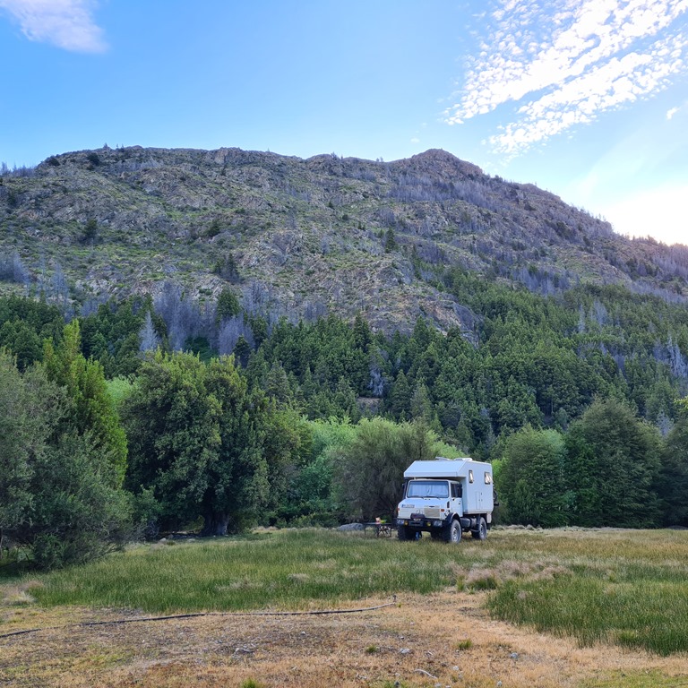 Da isses wieder! Das gelbe Licht für die Verschleißgrenze des Bremsbelages hinten. Jetzt geht sie nicht mehr aus. Wir hatten Mogl in einer Werkstatt für LKW in Inspektion – die übrigens ebenfalls die LKW der von DHL in Florstadt und Umgebung pflegen – mit dem Auftrag genau so etwas zu prüfen. Wenn es dann eben immer zwischen 800 und 2000m Höhe auf und ab geht, gibt es dann eben „nur” Motorbremse als Unterstützung. Wir kommen bei Klaus und Claudia, die eine 18jährige Weltreise gemacht haben und viele Berichte und das Buch “Abgefahren” geschrieben haben. darüber. Sie leben nun seit mehr als 30 Jahren hier. Es ist ein einfacher, sehr einsamer Platz in den Bergen kurz vor El Bolson. Schon interessant am Ende nach so langer Reise in der Welt diesen einsamen Platz für sich und die Familie gefunden zu haben. El Bolson hat noch einen schönen Kunsthandwerksmarkt wir lassen uns Zeit und fahren dann weiter zu Amancay nach Epuyen. Die Notleuchte nervt.![]()