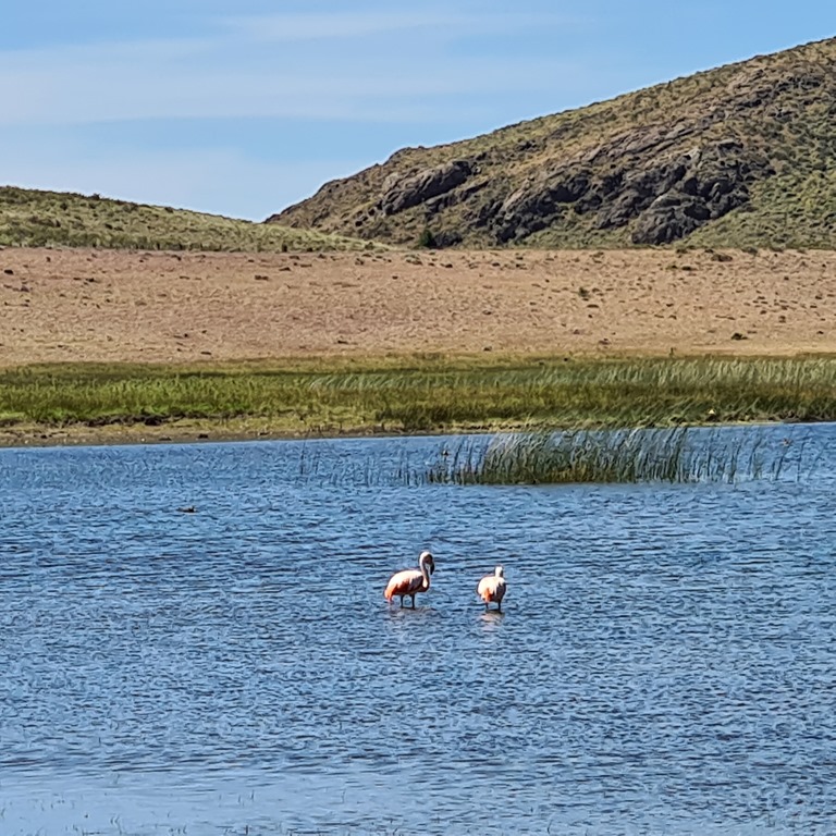 Dann können wir wirklich ohne Probleme weiter fahren! Der Schock war nur! Die Beläge waren schon komplett unter auf Metall und das Getriebeöl, was wir noch haben prüfen lassen – es fehlten von 2,8 Liter -1,4 Liter– Krass –wir werden die in Werkstatt in Altenstadt wohl noch mal interviewen, was da wohl schiefgelaufen ist …Wir verabschieden uns von Amancay und ihrer herzlichen Begleitung und machen uns auf nach Tecka. Die Landschaft ändert sich wieder in Steppe, etwas grüner mit einigen wechselnden Gebirgen. Ein See hier einer dort. Schafe da und Nandu´s hier.Da entdecke ich sie – Flamingos! Wie schön ist das denn!! In Tecka ist dann Weihnachten – neben uns wir ein Zicklein mit der ganzen Familie gegrillt, geschwätzt und die Zeit genossen. Üblich in Argentinien, das Zicklein ist dann um Mitternacht fertig – wir sind zwar eingeladen, haben aber schon gegessen und eigentlich auf dem Weg in die Horizontale.![]()