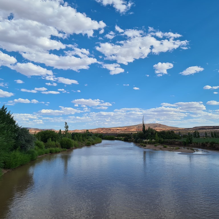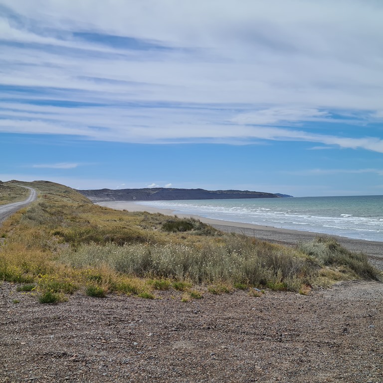 Der erste Tag im Neuen Jahr begrüßt mit freundlichen Sonnenschein, etwas Wind – herrlich. Die Wühlmaus ist schnell abgeladen und ich sause über die Costanera entlang des Meer über Hügel und sehe schon die kommenden Steilküsten. Ich sehe Füchse und ein paar Schildkröten die meinen Weg queren. Dann geht´s ab durch das Inland um Dieter mit Mogl zu treffen, wieder aufzuladen und in Richtung El Condor zu fahren. Ab Viedma überrascht uns die Veränderung der Landschaft. Hier gibt es offensichtlich entlang des Rio Negro viel Wasser, so dass richtig Landwirtschaft betrieben werden kann, mit Gemüseanbau, grüne Felder.