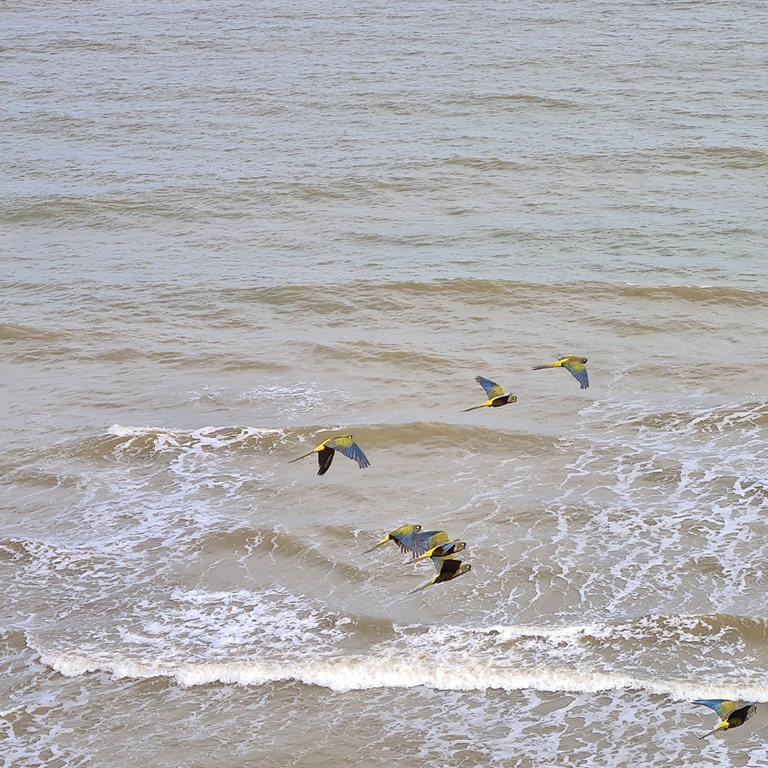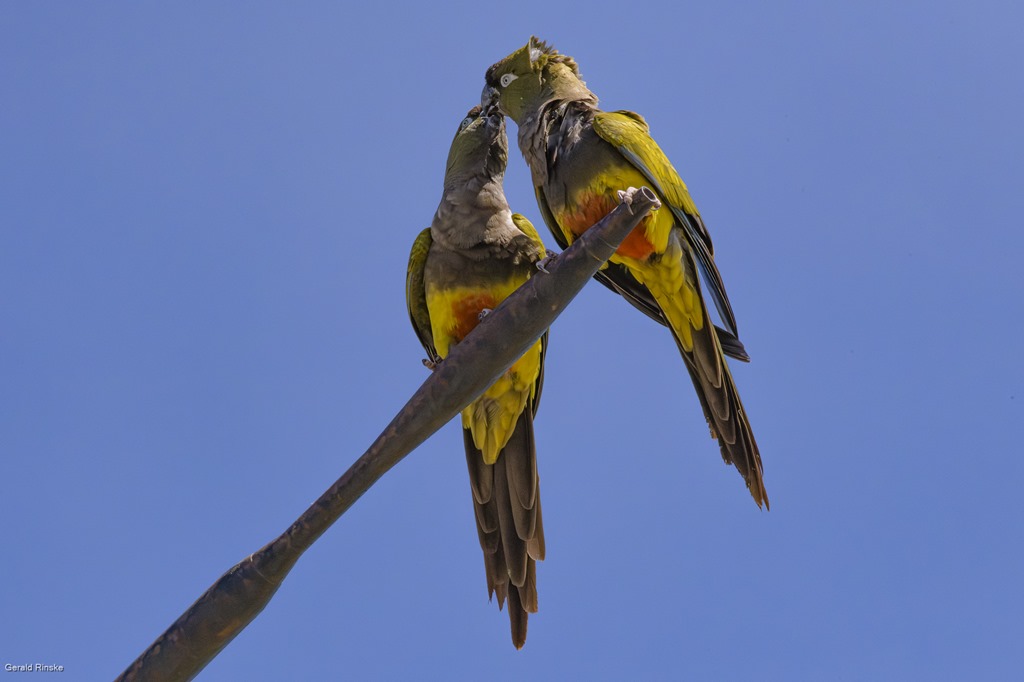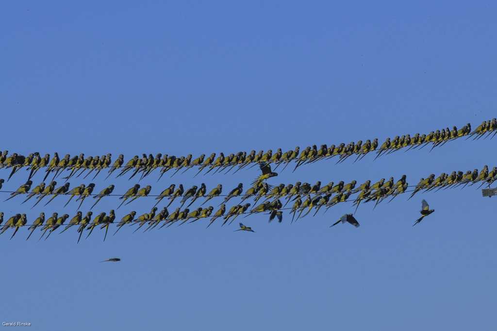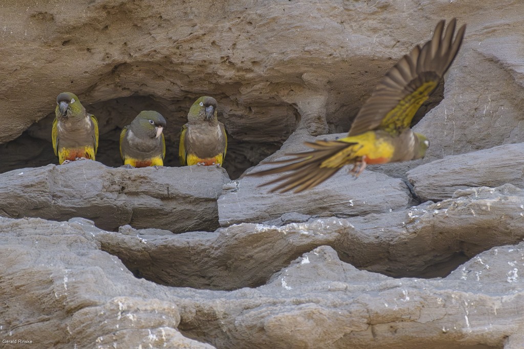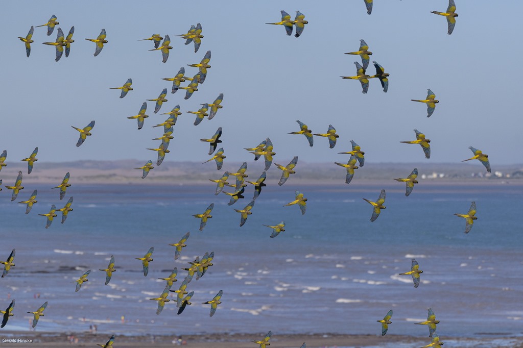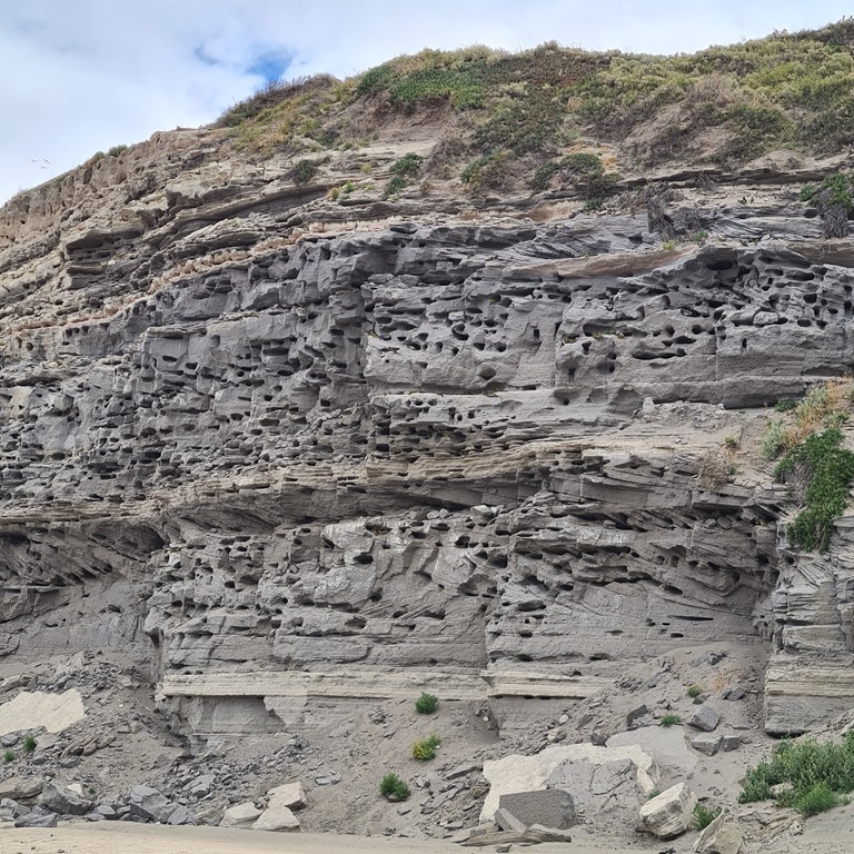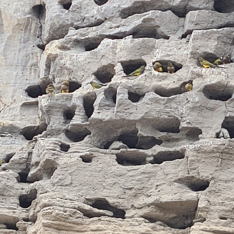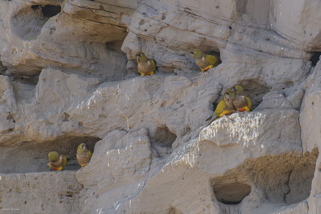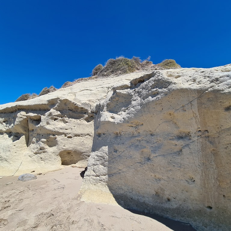 El Condor ist ein kleiner Ort an der Küste und an der Mündung des Rio Negro. Es hat ein paar wirklich schöne Ecken. Hier wollen wir die Nacht bleiben und entschließen uns an der “Promenade” zum Strand mit ein paar argentinischen Womos hinzustellen. Aber erst das wichtige! in El Condor gibt es die weltweit größte Kolonie an Felsensittichen – Papageien! In Zeiten wie jetzt sind es in den Feldhängen über 18km bis zu 35 Tausend Papageien! Und die schnattern ganz schön rum! Der Ort El Condor hat nur 1 Tausend Einwohner!!! Die schätzenden, hektischen und geselligen Flatterer sind überall zu sehen, besonders lustig ist, wenn in der Kolonie, den Felsen eine neue Gruppe angeflogen kommt – der Bedarf sich schnatternd auszutauschen steigt und eine große Gruppe fliegt wieder los. Das ist schon wirklich lustig zu beobachten und die Vögel sind hübsch und echt niedlich. Dann noch der Leuchtturm, und das in Patagonien viel vertretene Denkmal zu den Falkland Inseln. Da entdecken wir durch Zufall ein Pärchen Kaninchen-Eulen, mit Jungen. Später sitzen wir am Mogl und werden wieder mal begrüßt, Feliz Ano Nuevo gewünscht, zu dem Fahrzeug gefragt, da hält ein Pickup, der Herr steigt aus begrüßt uns ,er meint, wir kämen aus Deutschland, ob er helfen kann, ob wir etwas brauchen, oder er beraten kann – sie würden sich freuen, dass wir ihr Land besuchen. Er kommt morgen noch mal vorbei, falls noch etwas ist…. Hammer! Ich bin fast fassungslos wie freundlich das ist!