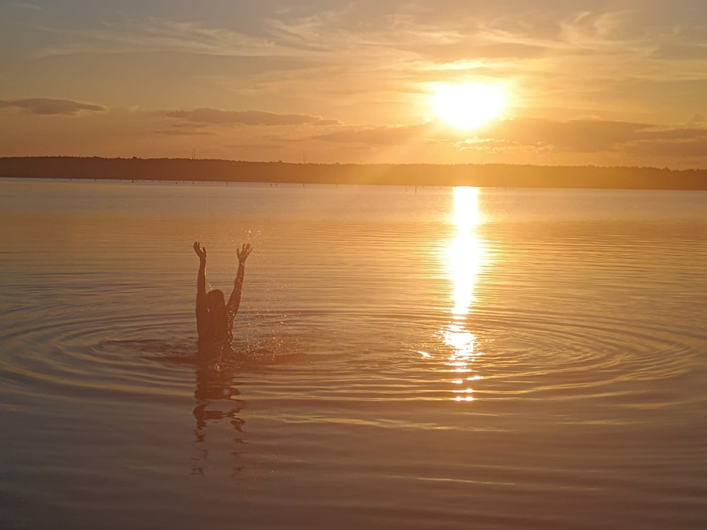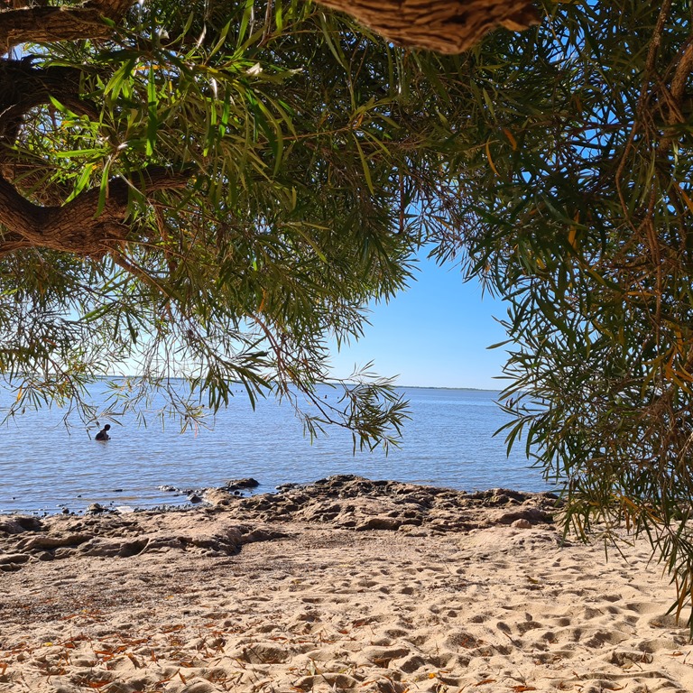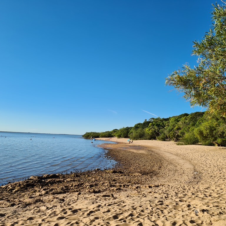 25 Grad im Schatten um 8Uhr! Hitzefrei!! Hihi, das haben wir ja schon. Wir sind über die erstaunliche Brücke über den Rio Uruguay bei Fray Bentos in Richtung Uruguay gefahren und wieder alle Zoll- und Einwanderungsformalitäten mit Geduld hinter uns gebracht. Dann rollen wir weiter in Richtung Las Canas einem Feriendomizil am Rio Uruguay. Wir finden einen schattigen Platz, ruhig, direkt am Fluss. Hier bleiben wir. Tarp und Hängematte raus und dann geht´s zum Fluss.