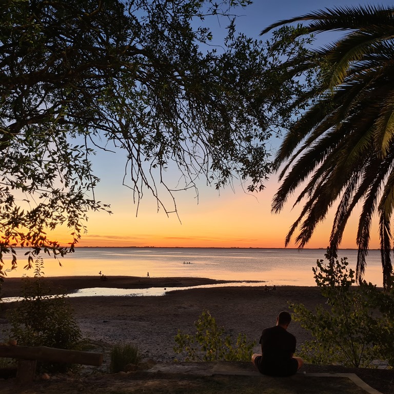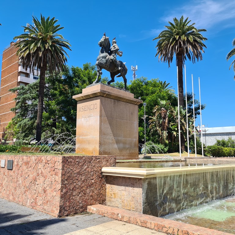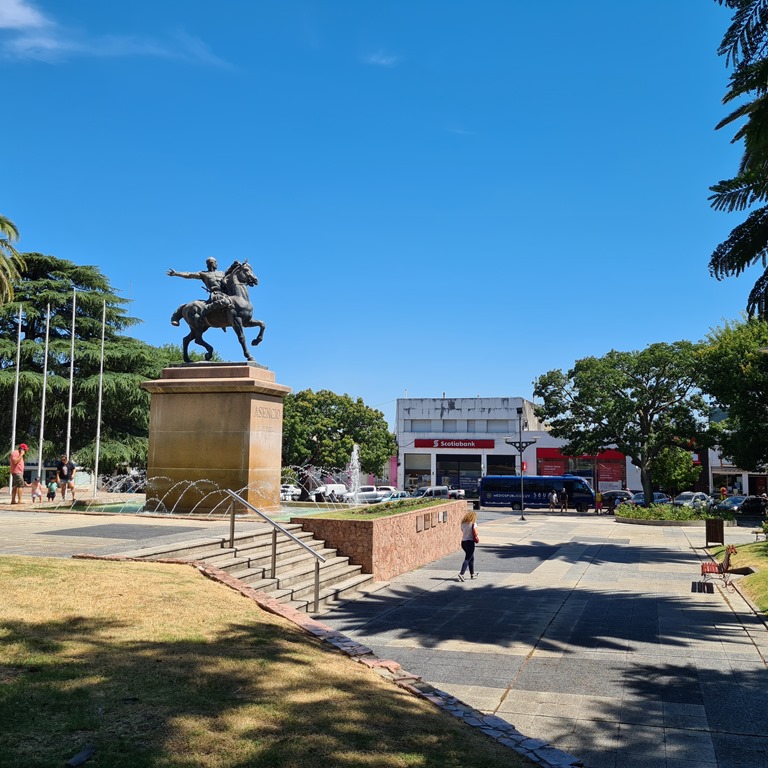 Wir wollen uns nun die Stadt Mercedes anschauen mit ihrer Rambla, Innenstadt dem Platz der Independencia mit Gaucho Statue und unsere Vorräte wieder füllen, da das nächste Ziel etwas weiter ab von größerer Infrastruktur ist. Nämlich El Palmar, ein Urlaubsort direkt am Stausee, zu lesen ist: mit wundervollen schattigen Campingplatz. Mercedes ist ein wilde Mischung zwischen “Neubauten” und den Gebäuden aus der Günderzeit. Uns fällt dies insbesondere bi dem Trompeter auf dem Dach der Kirche auf, der maximal 50cm weit weg ist von dem Hochhaus daneben. Als gäbe es keinen Platz. Es war wieder so heiss, dass die Mopedsitzbänke mit Pappkartons abgedeckt werden müssen. Es ist nicht die beste Temperatur für die Stadtbesichtigung. Wir satteln Mogl auf und fahren weiter nach El Palmar. Das was uns da erwartete war kurz: schrecklich. Der See stank schon von weitem, der Campingplatz und der Ort wirkten wie ein verlassener, vergessener Ort mit auch genau diesen Personen. Also für uns keine Option zu bleiben. Wieder weiter – nur wohin? Also doch in Richtung dem Naturschutzgebiet Grutas del Palacio. Da wollten wir ohnehin die nächsten Tage hin. Dort in der Nähe fanden wir wieder einen wunderschönen, super ruhigen Platz direkt am See mit einigen netten und unterhaltsamen Leuten. Manchmal ist eben ein Umweg doch von Vorteil.